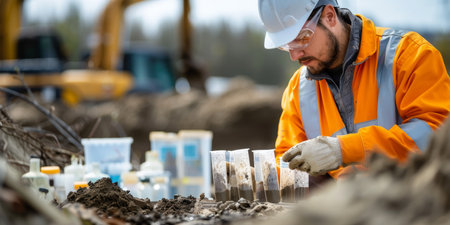 A worker in protective gear holds a bag of dry cement mix, showcasing labor at a construction site during the early hours of the day.