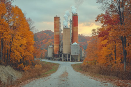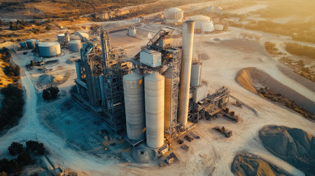 A large cement plant is located in a rural area, featuring towering silos and industrial equipment. The warm glow of the sun highlights the landscape, creating a striking view.