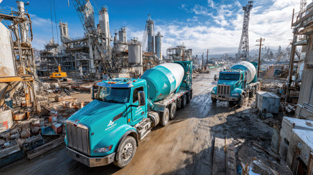 Two heavy construction trucks maneuver through a busy industrial site, delivering essential materials against a backdrop of machinery and clear blue sky.