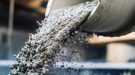 Close-up view of concrete being poured from a pipe at a construction site. The image captures the intricate texture and flow of this essential building material.