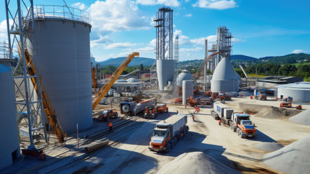 An aerial perspective showcases large industrial silos in a construction site. The scene captures machinery and materials, highlighting modern industrial operations.