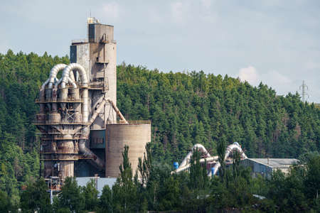 Industrial facilities of a cement plant on a sunny day. Pipes, tanks, stairs and rooms in an industrial complex in Valencia, Spain.