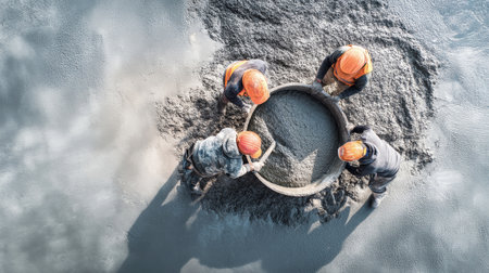 Skilled laborers spread liquid concrete at an open-air construction area, with a bright sky overhead, symbolizing progress in city expansion efforts.