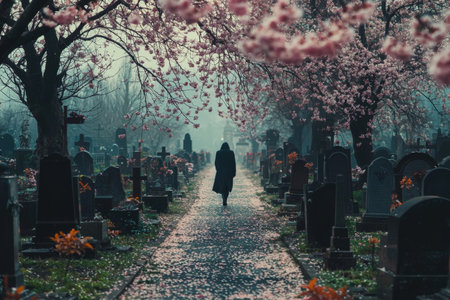 Lone figure walking along a quiet overgrown path in a cemetery surrounded by blooming cherry trees and a dreamy atmospheric ambiance The scene evokes a sense of solitude melancholy