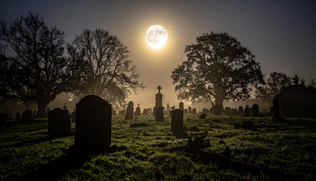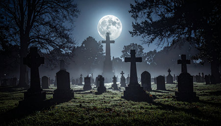 A chilling scene of a haunted cemetery bathed in eerie fog Tombstones loom ominously, casting long shadows in the moonlight The perfect setting for spooky Halloween decorations, horror movie scenes, or ghost story inspiration The atmosphere is thick with mystery and a sense of the unknown AI Generative