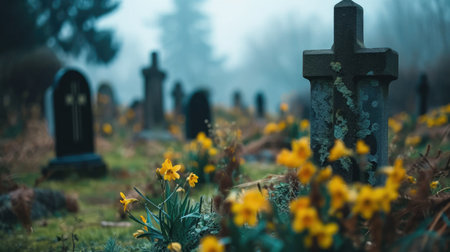 A graveyard with tombstones and flowers, AI