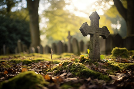 Serene catholic cemetery tranquil grave marker and cross amid softly blurred background