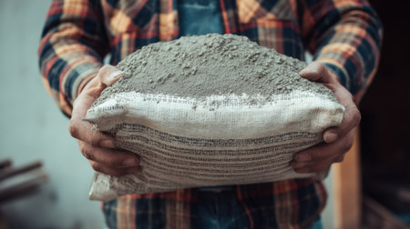 A worker grips a bag of dry cement mix, preparing for construction tasks in a busy work environment with natural light lingering.