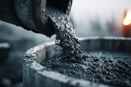 Workers skillfully direct a steady stream of concrete from a high chute into a prepped urban mold, laying the groundwork for modern infrastructure.