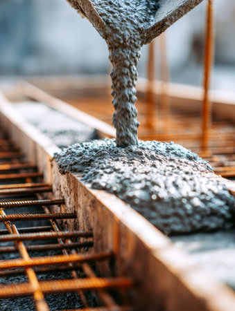 A detailed close-up captures the process of fresh concrete being poured from a shovel onto steel bars, showcasing the precision and effort in construction work.