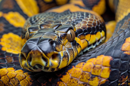 A detailed close-up of a snake with vibrant yellow and black scales, set against a dark background. the striking contrast highlights the intricate patterns and textures, perfect for wildlife enthusiasts and creative design uses.