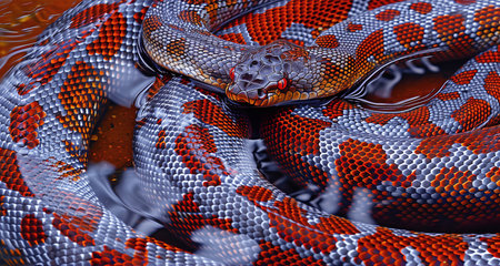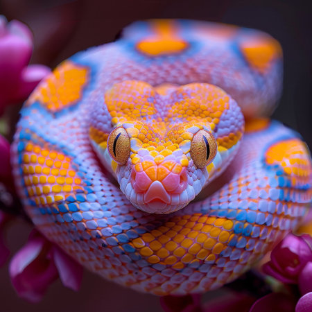 A vividly colored python with striking patterns coiled among bright flowers. The snakes scales shine under soft light, showcasing orange and blue hues in a peaceful natural environment..