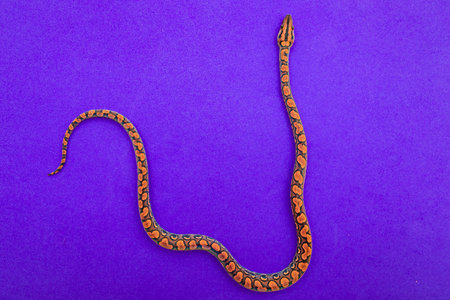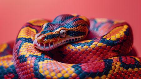 Close-up of a vibrant colored snake with intricate patterns, set against a pink background, highlighting its scales and textures.
