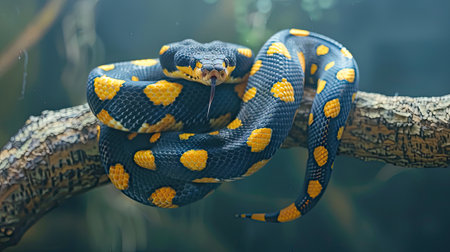 Colorful blue and orange python snake on a vibrant yellow background, showcasing a vibrant color contrast that captivates the viewer s attention