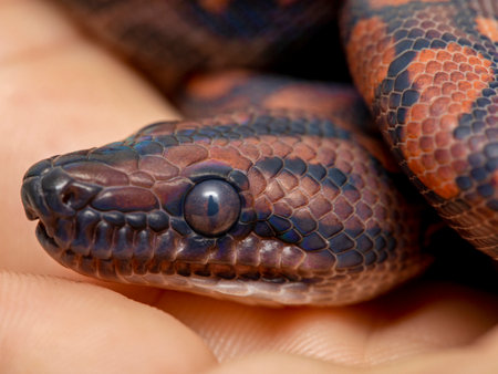 Epicrates cenchria maurus. Brown rainbow boa portrait on black background. Snake exotic pet studio shot