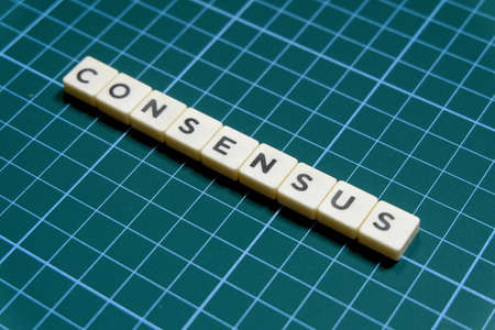 Selective focus of Consensus word made of square letter block on green square mat background.