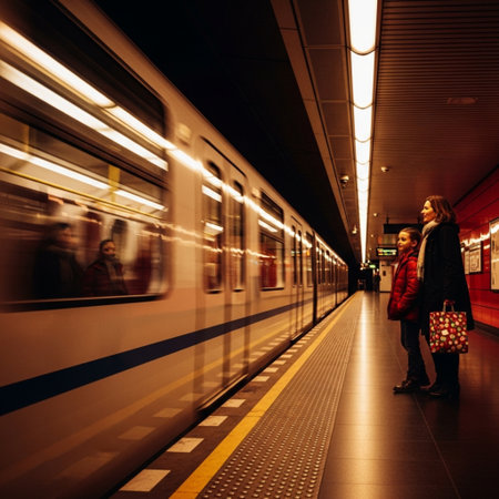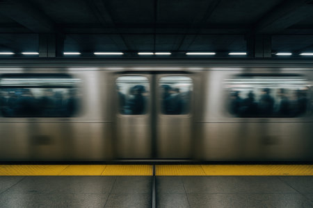 passengers at subway station with blurred train passing, a snapshot of fast-paced city transport.