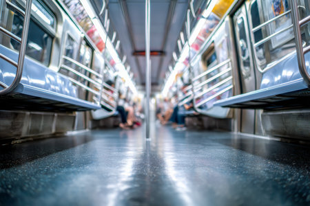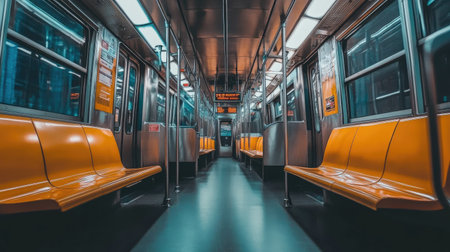 Empty subway car. Interior of the metro train with seats. Generative AI illustration