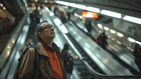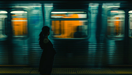 Businessman in a suit waits for a train at a dimly-lit subway station, symbolizing urban life