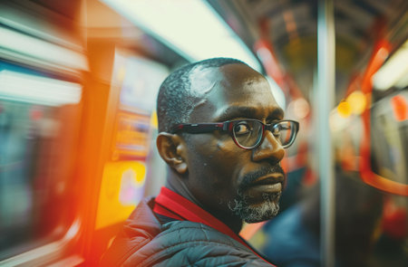 A diverse group of individuals sitting together on a subway train, commuting through a city.