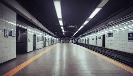 A deserted subway station with empty platforms and a train waiting at the station, dimly lit with fluorescent lights