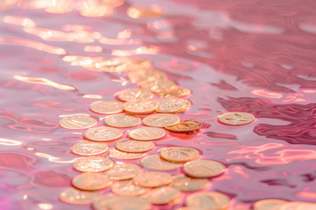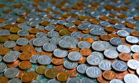 A Coins scattered on dark surface, showcasing various denominations and textures, creating interesting visual pattern. arrangement highlights metallic shine and details of each coin