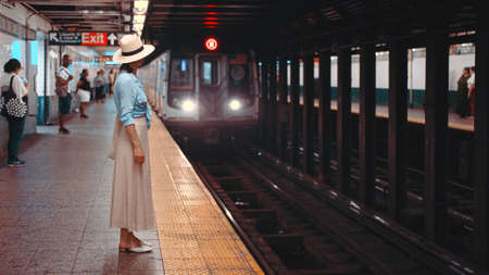 new york city, 11 september 2015: people wait on platform of subway station bowling green in lower manhattan new york city