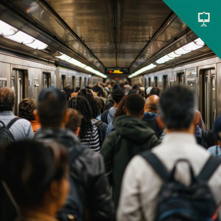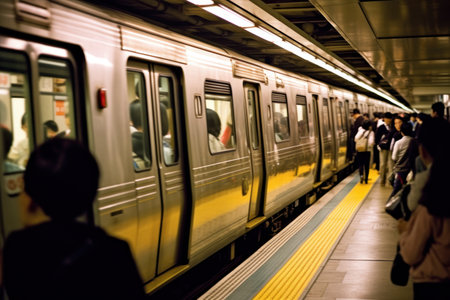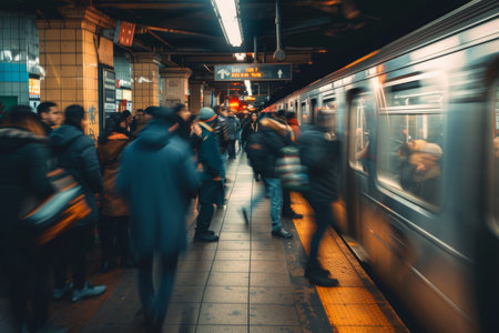 A bustling subway scene with diverse commuters navigating the platform during rush hour. The vivid image captures the dynamics and vibrancy of urban public transportation.