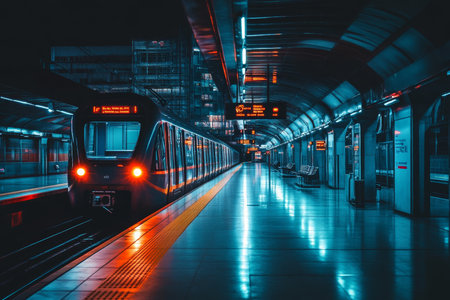 Modern subway train arriving in futuristic underground station.
