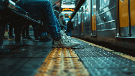 A bustling subway station platform filled with people waiting and boarding trains, showcasing urban life in motion