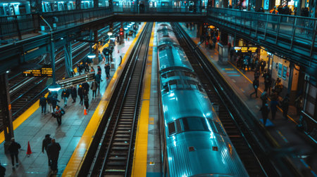 Commuters navigate a busy urban train station at night, illuminated by bright lights, as trains arrive and depart, creating a lively atmosphere full of movement.