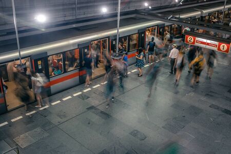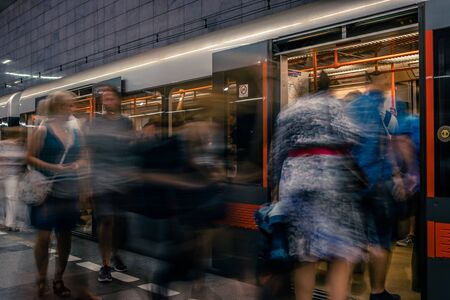 People in a subway station. Traffic flow motion blur effect.