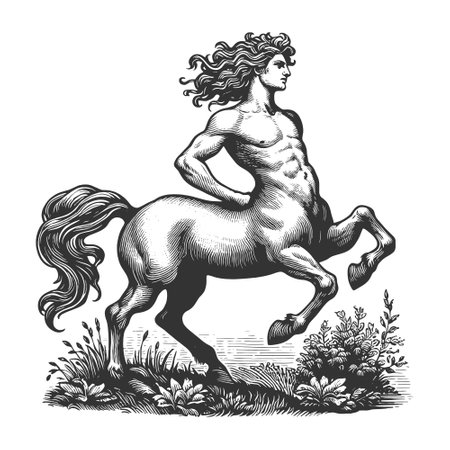 powerful centaur rearing on hind legs, set in a natural landscape, strength, mythology, and fantasy sketch engraving generative ai vector illustration. Scratch board imitation. Black and white image.