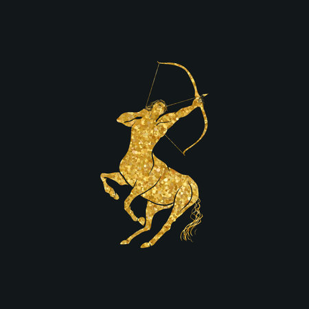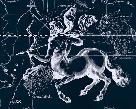 Dark blue zodiac sign Sagittarius with a silhouette image of a half man, half horse with a bow and arrow.