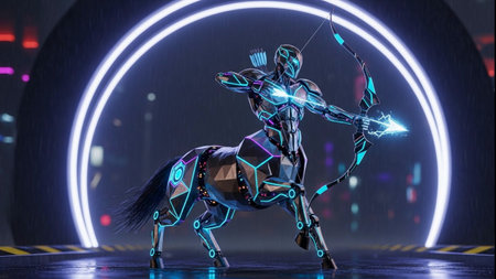 Futuristic centaur archer aims with glowing bow in polygonal digital landscape.