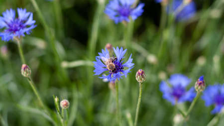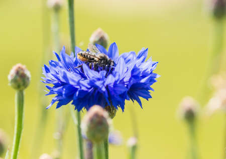 Bee is sitting on cornflower closeup photo with blurred background. Beautiful flower of blue cyanus on green field. Collecting nectar by apis for honey production. Traditional alternative medicine