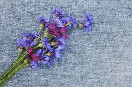 Cornflowers. Wild Blue Flowers. Bouquet of wild blue flowers on light background. Art design background or template for greeting card. Flat lay with copy space.Vertical.