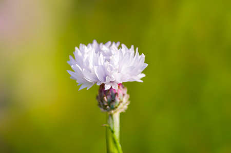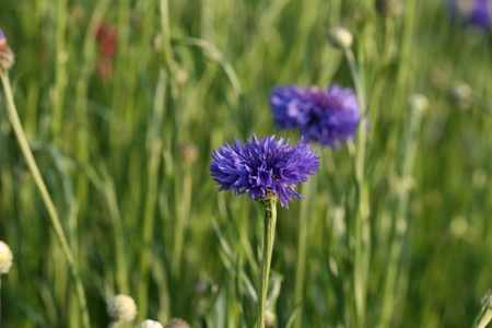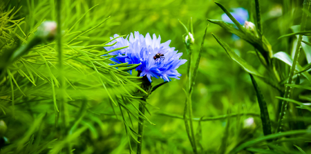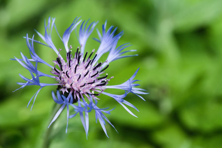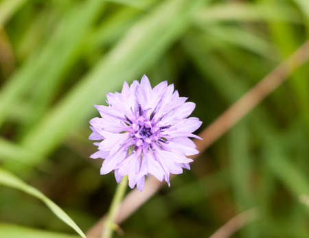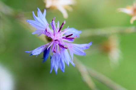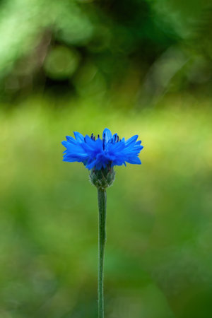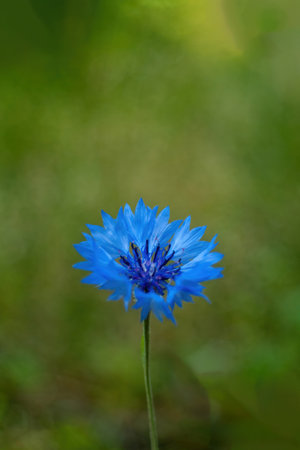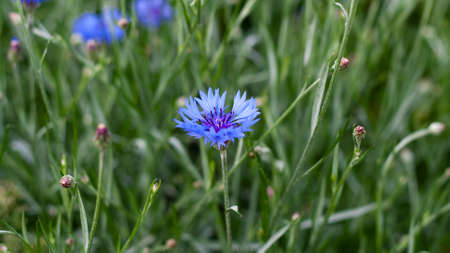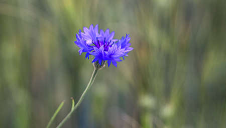 Wild flower blue cornflower or Centaurea cyanus on a green background, Plana mountain, Bulgaria