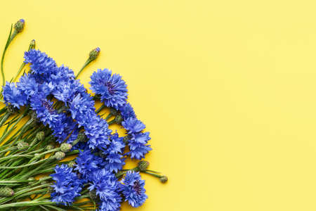 Blue cornflowers bouquet on a bright yellow background. Greeting card. Top view, copy space