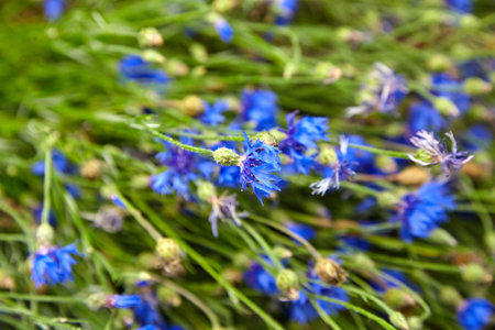 Blue wildflowers, cornflowers, on a green meadow in summer, in the sun. Selective focus. Bokeh. Copy space