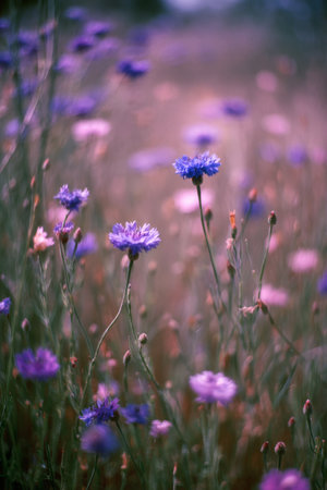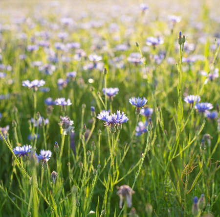 Cornflowers and green grass in sunset light in summer meadow, selective focus. Atmospheric beautiful moment. Wildflowers centaurea close up in warm light, summer in countryside. Environment