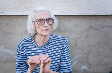 Senior women supporting on a walking cane outdoors