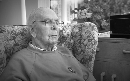 95 years old English man sitting in chair in domestic environment. Health and care concept