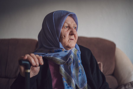 Portrait of an old thoughtful Muslim woman with her walking stick at home wearing traditional hijab, looking away.