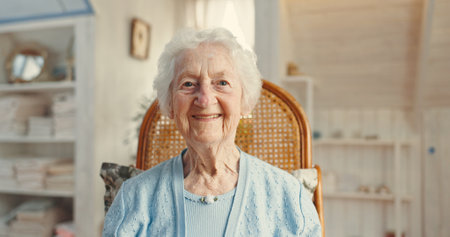 Portrait Old Female Looking At Camera Sitting At Home