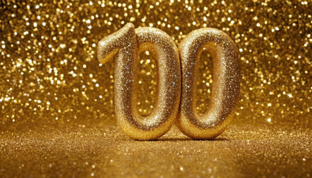 Number 100 gold celebration sparkling confetti. Festive abstract background.