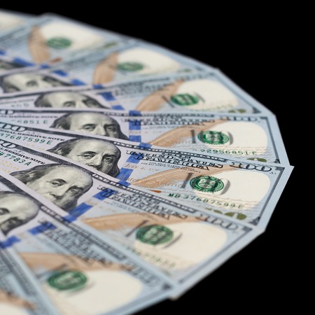 close up of several fan-shaped one hundred US dollars banknotes