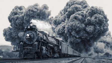 A classic steam train engine is depicted with large plumes of smoke billowing into the air. The monochrome image showcases the train's intricate mechanical details. The composition may be suitable for illustrating historical transportation, railway technology, or vintage industrial themes. The scene evokes a sense of nostalgia.