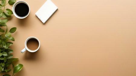 Copy space for text in cozy home working table, natural beige background with knitted sweaters, coffee, plants, notepad, top view