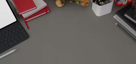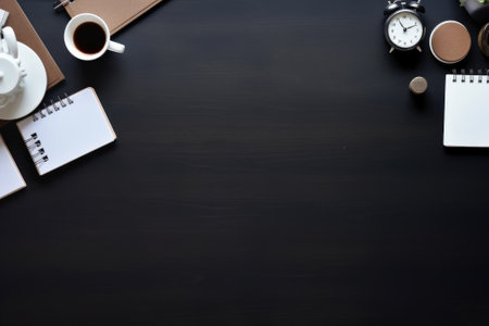 Top view of dark modern workplace with copy space and office supplies on dark grey desk background